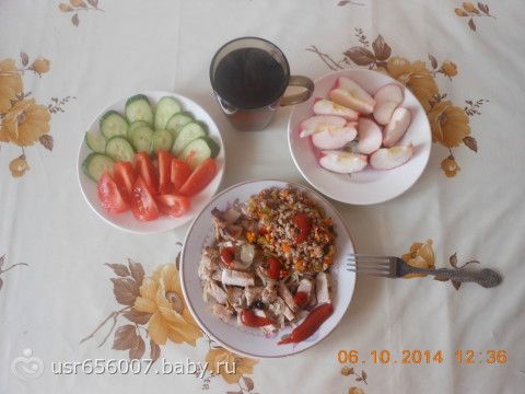 1/2 помидорки, яблоко, земляничный чай! съела почти все овощи! шашлык с гречкой половина осталась) и 1/2 яблока! не осилила!!!
