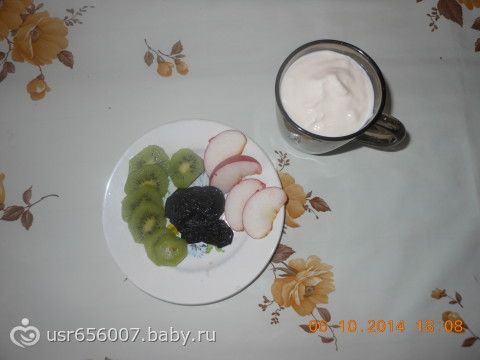 1/4 яблока, 1 киви, 5 черносливин, ряженка. захотелось сладкого- поэтому опять чернослив((