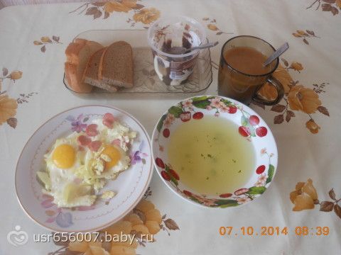 вчера пока готовила своим супчик с курочки- так что то бульона захотелось))) поэтому он у меня на завтрак, 2 жарен. яйца+1 детская сосиска+ 1 кусочек темного хлеба+ кофе без сахара+ 1 бутерброд с шоколад. пастой))) наааеееееласььь)))