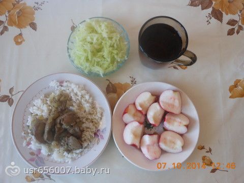 отварной рис+ печень куриная тушеная с луком+ 1 мелкая редька протертая на крупной терке+ 2 яблока+ травяной чай! (съела только 1 яблоко)