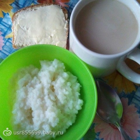Завтрак:рисовая молочная каша, 2куска хлеба с маслом, чай с молоком