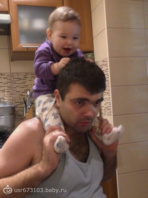 А сынуля нас тоже не оставил нас без подарка ведь у него вылез первый зубик!!! :-):-):-) так что праздник удался хоть и устали мы все. А вот и фото сына который любит дергать за волосы и кататься на папе
