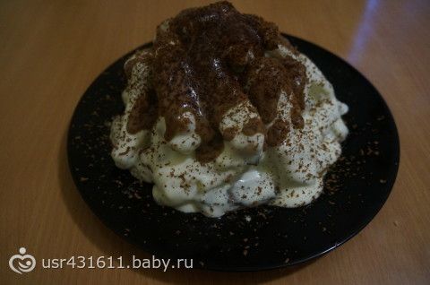 Делаем заварное тесто: В кастрюлю наливаем 1 стакан воды и кидаем туда 100 гр масла сливочного, немного сахара, когда масло растопиться высыпаем туда 1 стакан муки.Вымешиваем заварное тесто.Когда оно станет однородным держим на огне катая по кастрюле ещё 2 минуты, выключаем, даём остынуть и вбиваем туда 4-5 яиц по одному.Должна получиться вязкая масса.Складываем её в кондитерский мешок или плотный-плотный пакет и формируем на противне, смазанным маслом, небольшие тонкие колбаски(пальчики).Ставим в хорошо разогретую духовку, и оставляем 5-7 минут на большом огне, чтобы эклеры поднялись, затем делаем тихий огонь и выпекаем ещё 12-15 минут.Духовку не открывать!!! Смотреть через стекло.Как только верх зарумянился вытаскиваем, даём остынуть.Затем обмакиваем в крем: сметана(800г)+сахарная пудра, сахар(на ваш вкус).Складываем палочки плотно друг к другу в разъёмную форму без дна, положенную на разнос, в котором будет находится торт.Когда форма полностью будет заполнена палочками в креме накрываем форму дном этой же формы и слегка придавливаем.Отправляем в холодильник на 3 часа, чтобы крем с палочками схватился.Затем достаём, обмазываем взбитыми сливками(33% сливки+столовая ложка сахара).Украшаем по желанию.Между палочками внутри можно выложить тонкий слой любимых фруктов(не переусердствуйте, а не то торт раскиснет)