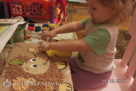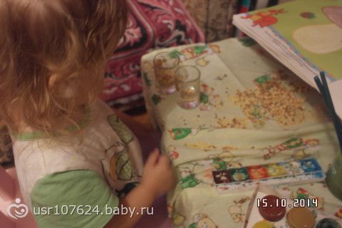 мы очень старались, ведь это первая наша поделка для сада, доча была в восторге, а мама жуть как устала, ведь потом еще уборка предстояла огромная, крупа была рассыпана везде...