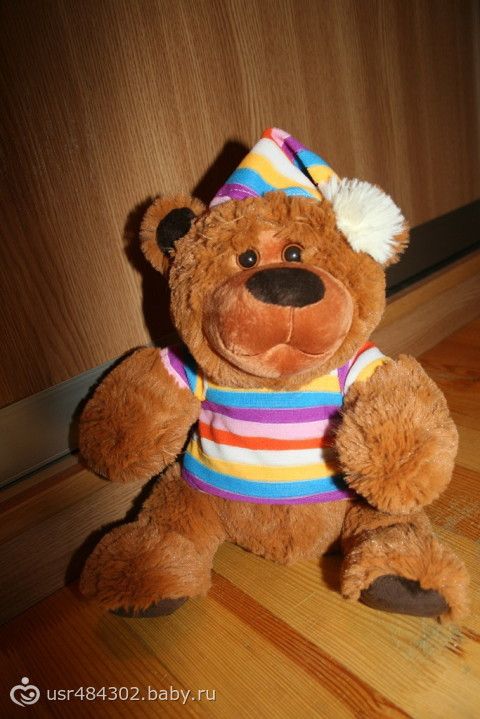 Этот мишка очень приятный на ощупь, он умеет рассказывать 4 сказки. Если надоест, то можно через кабель записать новые.