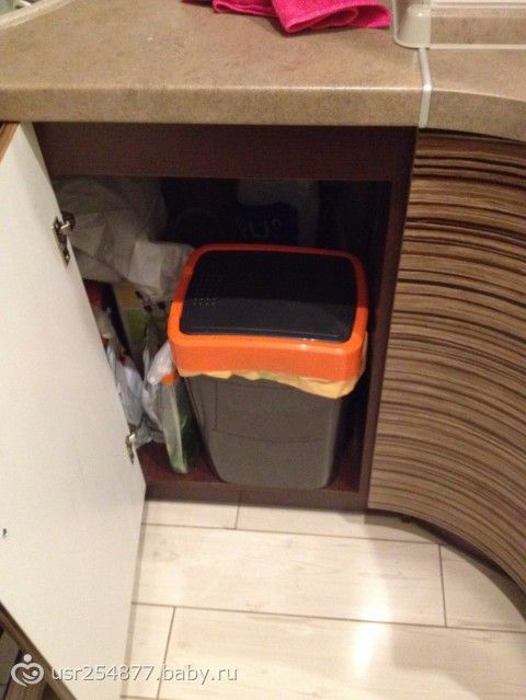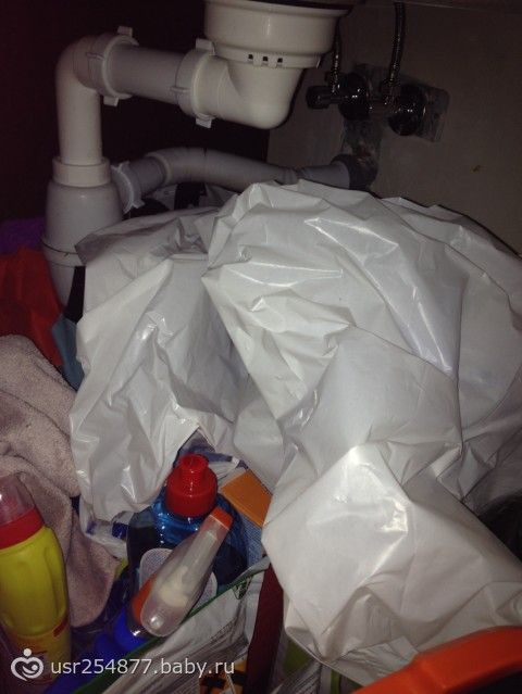 Раковина моя матовая, в пупырышек (может неверно выражаюсь). Муж хитрюга выбирал, наверное чтобы не мыть до блеска!?! Под мойкой у меня уживаются 10 кг песка в мешке, картошка, веник и совок, пемолюкс, фейри запасная бутылка ( люблю запасать) и, конечно, мусорное ведро. Ведро я помыла, мешки подвинула, пакет с мусором выносит муж утром, когда идет на работу (это традиция, мною заведенная). Вот что получилось: