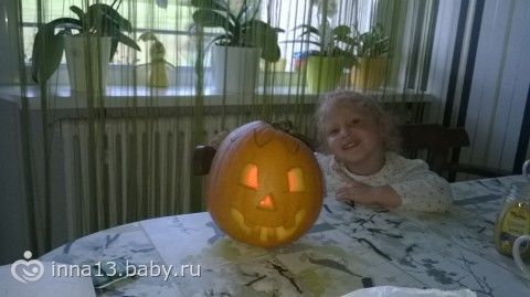 сначало надо крышечку отрезать, потом всё мягкое выковырять потом мы восковым мелком нависовали и вырезали вот всё и готово. только мы в свою электронную свечку ставим, от простой тыква сильно нагревается( испортится быстро)
