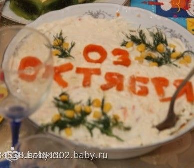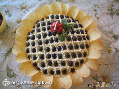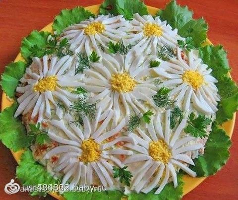 Красота. Помню, я делала на свой юбилей салат с ромашкам — Ромашковое поле.