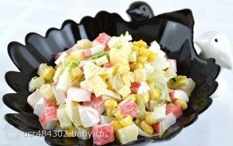 В салатник положить крабовые палочки, пекинскую капусту, ананасы, кукурузу.