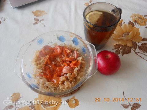 тушеная капуста, сосиска, подлива, чай с лимоном, яблоко