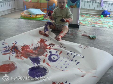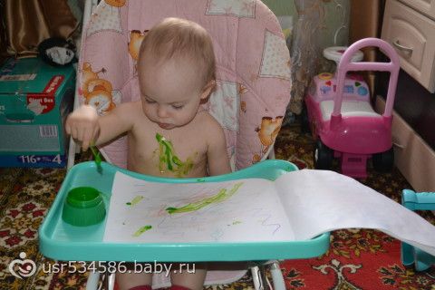 у меня сын возюкался как все малыши, а дочка все за братом повторяет, когда она начала рисовать ему уже больше трех было — и она начала рисовать сразу как он — кисточкой и достаточно аккуратно. вот сын в год и четыре