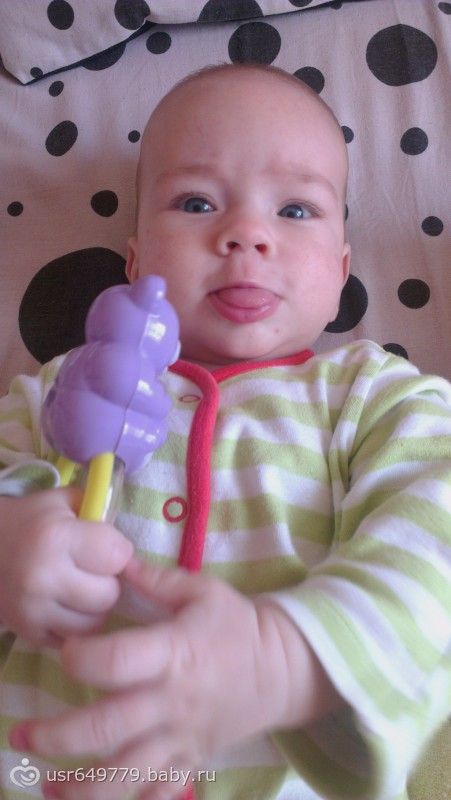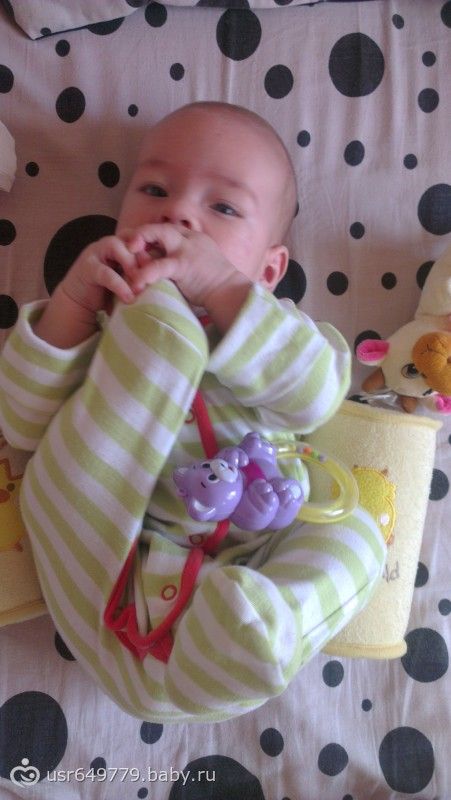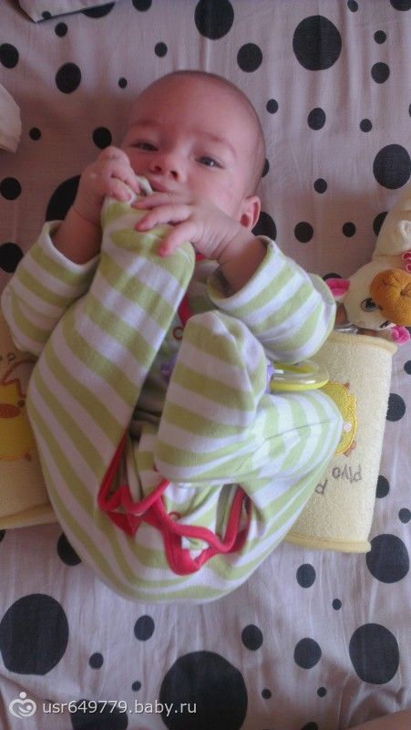 Приветик всем. Ну вот теперь и нам 4 месяца сегодня. Рост 70см вес 6600г в 3 месяца были 66см 6100г (родились 56см 3860гр) незнаю как в этом месяце наберем… Докармливаю смесью теперь два раза в день по 120 мл вместо 180 положенных. Хотела чтобы было исключительно ГВ, но что поделать, боролась всеми способами до последнего, но и сейчас грудью кормить не в коем случае не брошу. Сын растет так быстро, что аж плакать хочется:-) не успеваю насладиться. Каждый день что-то новое учится делать. По кровати только и успеваю ловить, с живота на спину и наоборот. Игрушками играет во всю, даже есть любимые))) особенно ванька-встанька который сохранился еще года так с 74-75))) всё тащит в рот, что не получается сосать и кусать то мы облизываем))) слюни рекой бегут, вроде как зуб что ли лезет, уже неделю толком ночью не сплю. Внезапные истерики случаются. Любит смотреть телевизор а когда интерны или воронины идут так еще и смеется)) кстати вчера начал в голос смеяться. Так смешно, мы с мужем вчера чуть не лопнули со смеха)) купаться мы любим под душем, ванна нас не прикалывает. Струи ловит и смеется)) Присаживать немного начала, так ему так не нравится, пытается садиться. Разговаривает во всю диалоги с нами ведет. Пюре немного кушаем, яблочное и чернослив. Ну так вроде все)) ну и фотки на последок