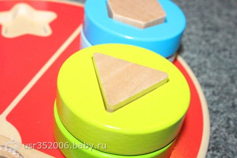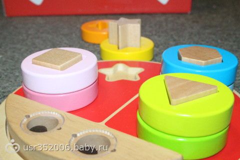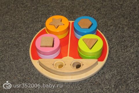 Без присутствия какого-либо запаха от игрушки. На основании игрушки четыре колышка: квадрат, треугольник, шестиугольник и звездочка, на которые ребёнок подбирает детали, которые сделаны в виде круга, имеют свой цвет и соответствуют определённому колышку. Колышку квадрат – круглая деталь, середина которой сделана в виде квадрата, колышку треугольник — круглая деталь, середина которой сделана в виде треугольника, колышку шестиугольник — круглая деталь, середина которой сделана в виде шестиугольника, колышку звездочка — круглая деталь, середина которой сделана в виде звездочки. Цвета деталей разные здесь и голубой, и синий, и зеленый, и салатовый, и желтый, и оранжевый, и розовый, и светло розовый. Малыш сначала должен установить сходство между отверстием и формой колышка, и только тогда ставить его. Две круглые детали, которые одеваются на определённое колышко, примерно одинакового цвета, например, один цвет синий, значит второй голубой, не только помогают деткам определять те детали, которые подойдут к той или иной фигурке-колышку, но и носят обучающий характер. Игрушка Сортер Божья коровка помогает моему ребёнку развивать воображение, различать цвета, чтобы правильно надевать фигурки, складывать пирамидки, быть терпеливее. Дочка целыми днями играет сней. ) А Ваши малыши какими игрушками играются*?