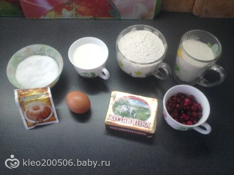 Мука — 240 гр, слив.масло/маргарин — 100 гр (использовала маргарин, получилось вообще вкусно), яйцо — 1 шт, сахар — 200 гр, молоко — 150 мл, разрыхлитель — 10 гр (2 ч.л.), соль — щепотка, клюква свежемороженая — 1 кружка, сахарная пудра.