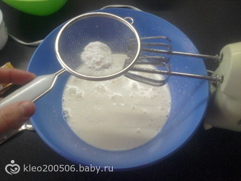 Влить молоко. Добавить соль, разрыхлитель и просеянную муку. Хорошо взбить миксером.