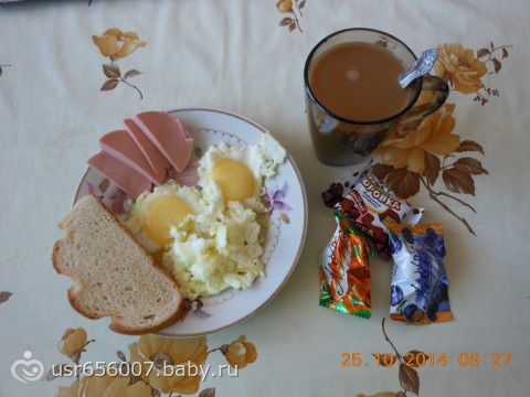 2 жареных яйца, 2 кусочка колбасы, кусочек батона, кофе с молоком и 3 конфеты......