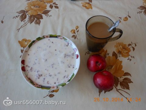 гречка с молоком (съела половину), кофе с молоком, 1 яблоко (второе не осилила)...