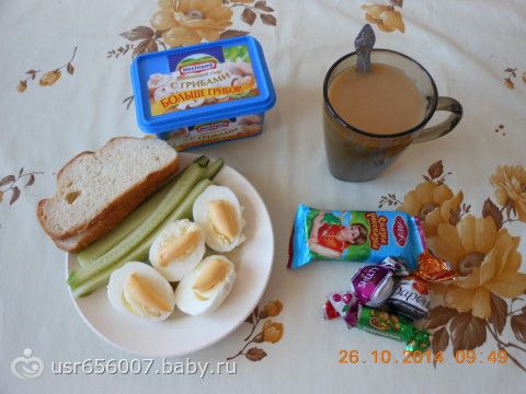 2 вареных яйца+соус майонезный, чуточку огурца, бутерброд с плавлен. сыром, кофе с молоком и 3 конфетки съела))))