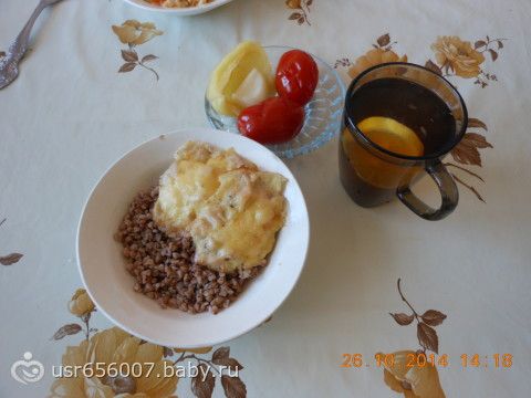 гречка, 2 куриных котетки, 2 соленых помидорки+немного перца, чай с лимоном...