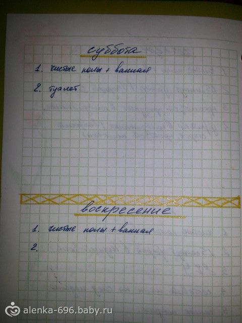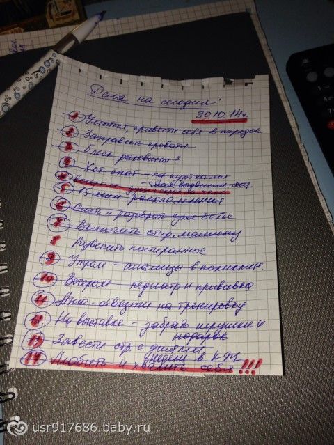 Список на сегодня составила, выполняла и зачеркивала. Удовлетворена!!! столько всего сделала, умница-то какая! Это еще не все- еще и посудомойку загрузила, полотенца в ванной поменяла, в магазин съездила с Машей)))