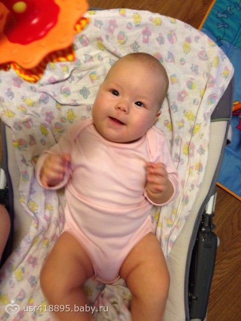 Перевернулись на живот на следующий день после того, как нам исполнилось 4 месяца. С тех пор на спине не лежим вообще. На спину назад она даже не собирается переворачивается. Просто не хочет, даже не пытается. Хотя, пару раз в мое отсутствие в кроватке она это сделала, но сам процесс я пропустила… :-/