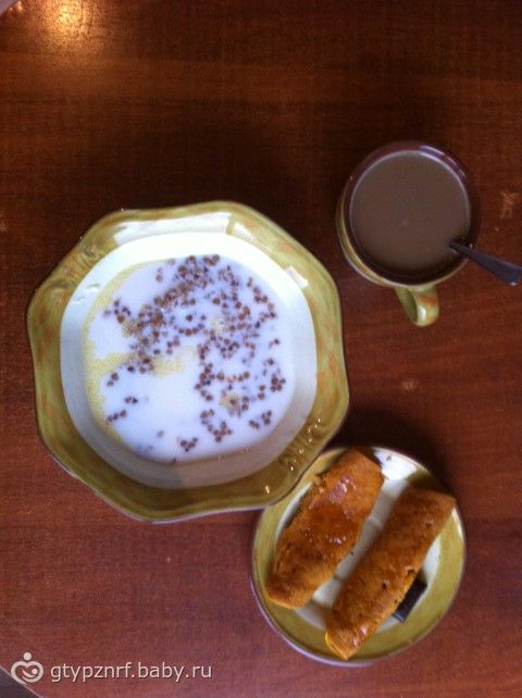Завтрак: Греча с молоком, тыквенные блинчики ПП (с медом они очень вкусные), кофе с молоком, горький шоколад.