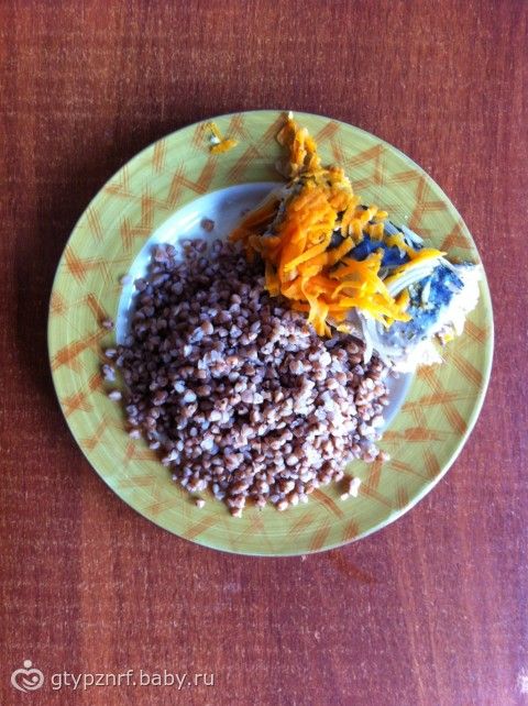 Обед: Греча, скумбрия запеченная в фольге с луком и морковью.