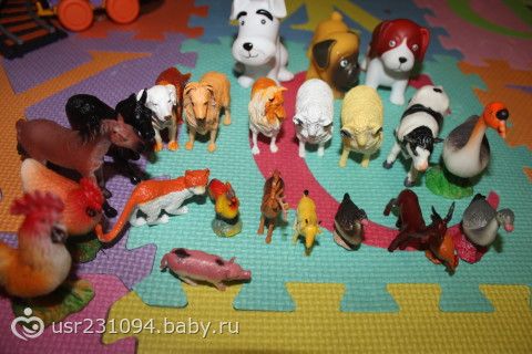 6. наши животные. Это пример. — не все они тут. там еще и дикие, еще и насекомые, и лягушки и змеи и паучки. всех знает, играет с ними, какает на машинках, поездах… подражает звукам которые они в жизни издают. что-то в нете заказывала, что-то на Алмазе у нас тут брала.