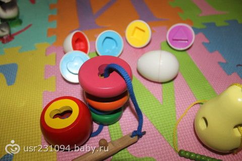 7. вот еще такие развивашки — логические. Ключ, на него колечки одеть нужно попадая в пазы. Пока не всегда справляется. одно два сделает и все, но прогресс есть. Яйца в Окей брала. нужно найти то которое подходит и попасть правильно что бы вошло и закрылось. Делает во всю порой, иногда бросает если тяжелые попадаются.