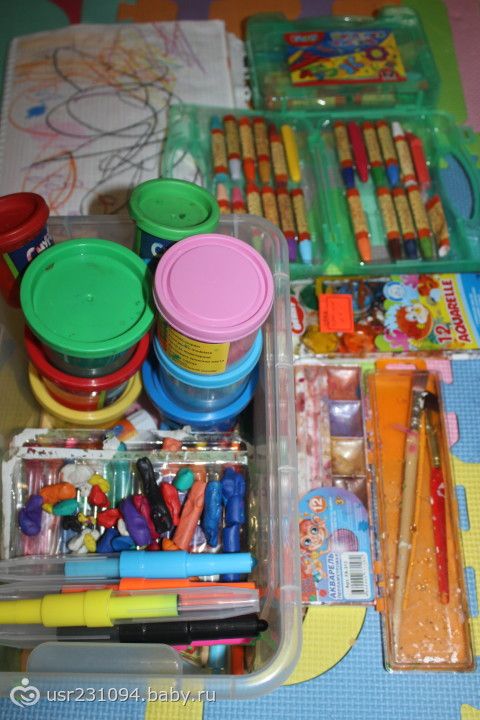 8. Наша коробка для творчества со всевозможным содержимым. карандаши разные, краски разные и пальчиковые и обычные. И разный пластелин — и тестом и обычный. и клей и фломастеры и большая тетрадь ля рисования. удобно кстати, что бы не тратить листы обычные А4. Фломастеры, которые видны в коробке, куплены в фикс-прайс — они и просто рисуют, и выдувать их можно — красиво получаются — развивает дыхательную систему и способность дуть. коробки не сохранилось...