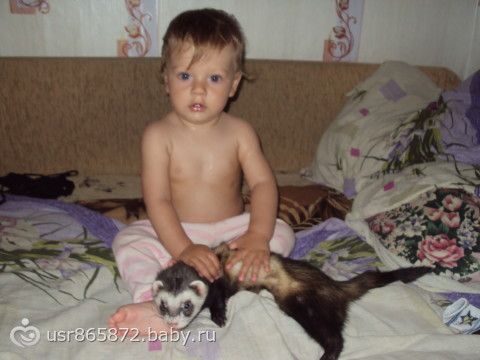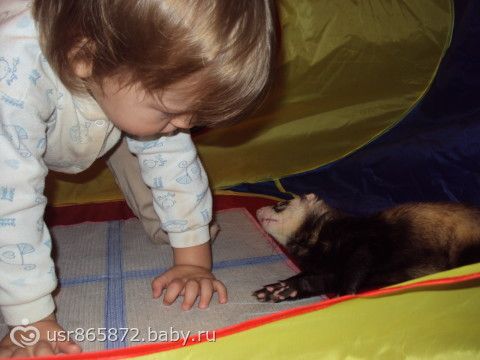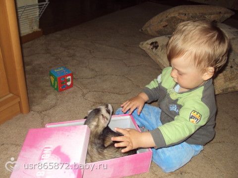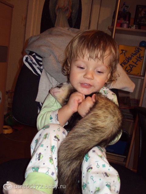 Все-таки я очень рада, что у нас дома живет этот мохнатый вредный шилопопый хорек))) Сначала боялась, что будет царапать и кусать ребенка, но нет) Иногда царапал меня, чтобы я не мешала мелкому заниматься чем-нибудь))) Сейчас они постоянно вместе играют. Могу спокойно оставить их вдвоем в комнате и уйти готовить обед. Естественно, при долгом затишье — сразу бегу к ним))) Ярик любит подкармливать Тошку разными вкусняшками типа печенья, банана, яблока… и уже пробовал тошин корм(((( ходит, хрустит им и ни в какую не выплевывает(((