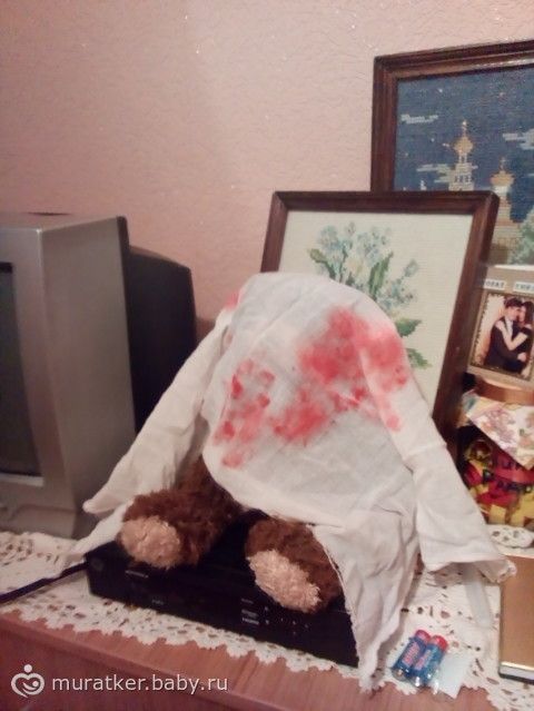 Потом надули шарики тематические, развесили по дому тряпочки, чтоб антураж создать.Заболели мишку)))))разрисовали тряпку красным и мишка у нас был пугалкой))