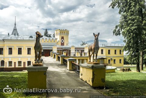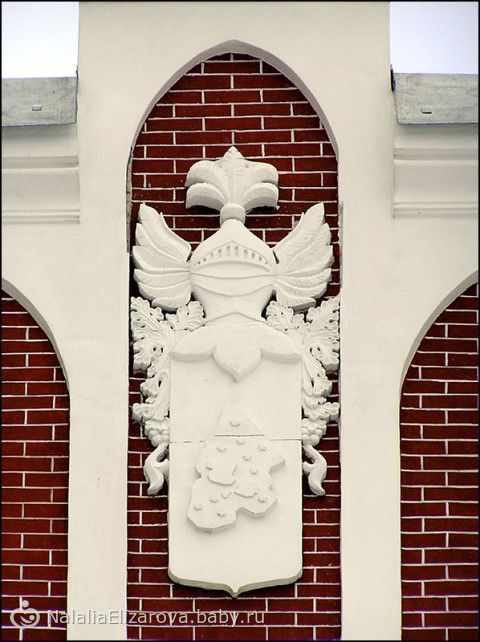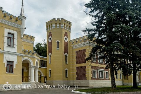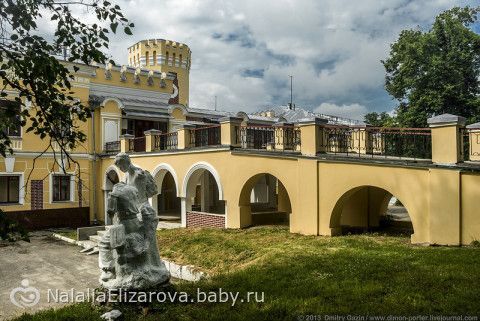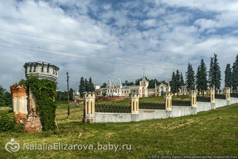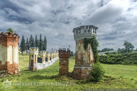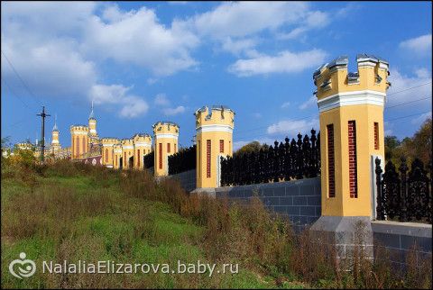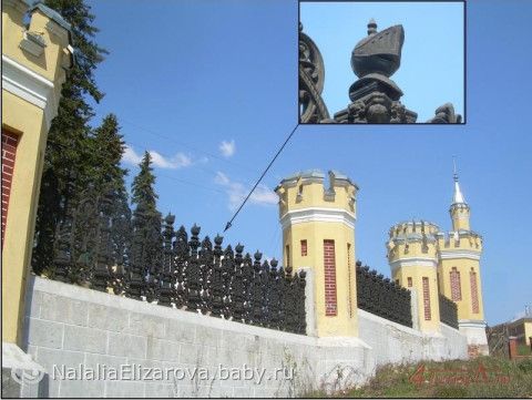 Усадьбу окружает интересное сооружение: ограда с башенками, напоминающими шахматные ладьи или сказочные готические башни.