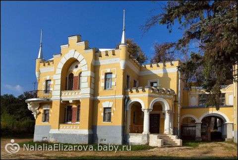 Берег, прорезанный оврагом, спускается к пойме Прони довольно плавно; на этом живописном плато, покрытом лесопарком, и раскинулась усадьба. В нее некогда, кроме сохранившегося до наших дней дворца, входили конный двор, висячие мосты через овраги, въездные ворота, гроты, система прудов, мельница, фруктовые сады. Роскошный замок-дворец напоминал виллу эпохи Возрождения, во внешнем облике которой присутствовали черты различных стилей — псевдоготического, мавританского, классицизма, барокко, модерна. Автором этого восхитительного произведения был тогда начинающий, никому не известный архитектор Федор Осипович Шехтель.