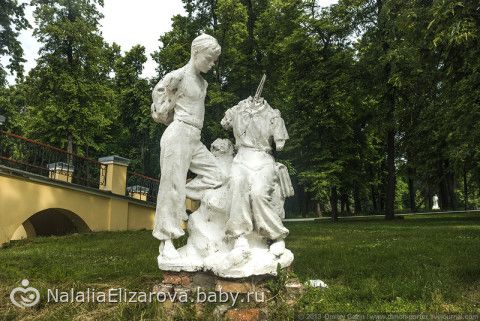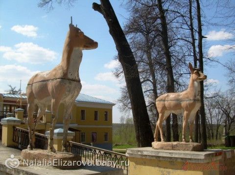 А чуть левее оленей на земле стоит белая скульптура, думаю, появившаяся на территории в советские времена (судя по пионерским галстукам).