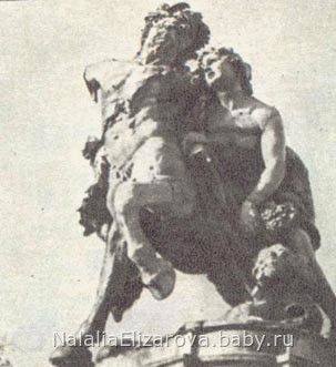 Вниз — к сложной системе прудов, мельнице и фруктовому саду — уводила ещё одна лестница, путь же был оформлен гротами из диких камней и настоящих кораллов, привезенных со Средиземного моря», и скульптурными изваяниями мощных бронзовых кентавров.