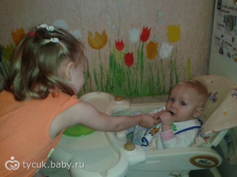 Хорошие у тебя детки, поэтому и нарасхват. Димулик уже хорошо сидит в стульчике, а наша ещё заваливается, кормлю в шезлонге или на руках.