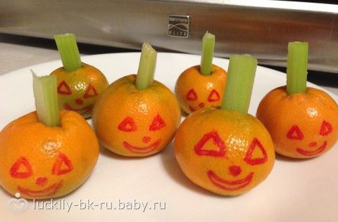 в садике Соня рассказала о ярмарке учительнице с которой занимается в книжном клубе, та быстренько нашлась как это можно превратить в игру и вуаля — на занятии была тематическая книга о хэллоуине Five Little Pumpkins и после чтения делали тыквы из мандаринов и сельдерея