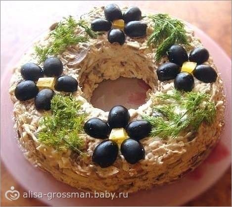 В середине плоского блюда поставить бутылку или стакан, выложить вокруг салат и немного придавить ложкой, чтобы не рассыпался.