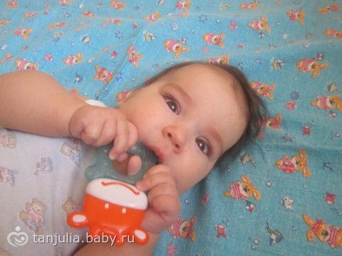 Анюта очень любит грызть и сосать свои пальцы, иногда грызет игрушки, но пальцы вкуснее и удобнее