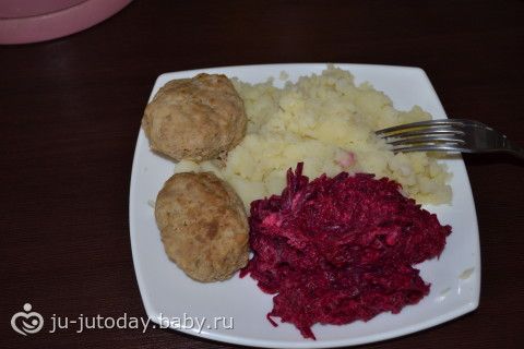 завтрак: картофельное пюре, 2 котлетки, салатик из свеклы с чесночком и майонезом, чай со сладостями