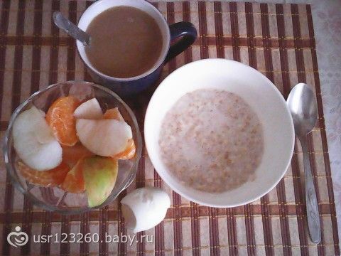 Завтрак: кофе с коричневым сахаром. 2 ст.л.молока, каша овсяная на молоководе, половинка яблока и мандарина, яйцо в крутую