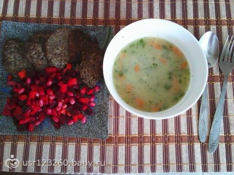 Обед: суп (горох, морковь, лук, зелень) гречнево-печеночные котлеты, салат (белая фасоль, свекла, морковь, перец свежий)