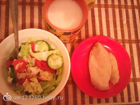 Ужин: запеченная грудка маринованная в кефире, салат (пекинка, помидор, огурец) кефир был выпит в 19.30
