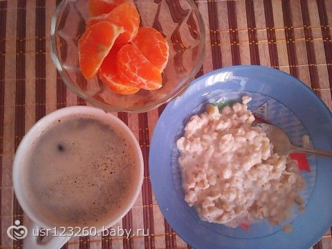 Завтрак: кофе с кори.сахаром, овсяная каша на молоководе, пол мандарина