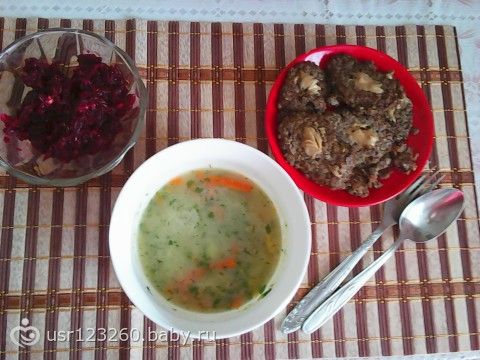 Обед: суп (горох, морковь, лук, зелень) котлеты печень(индейки)+гречка приправила горчицей (наконец то их доела), свекла с чесноком