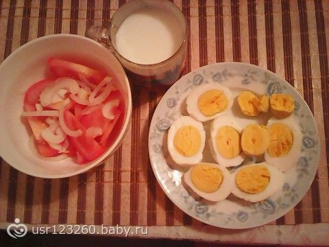 Ужин в 18.30: 3 яйца (захотелось жуть как) +1 желток (сын подкинул), полпомидора с луком. Кефир — в 20.00