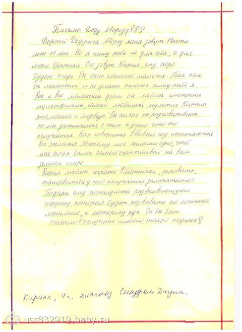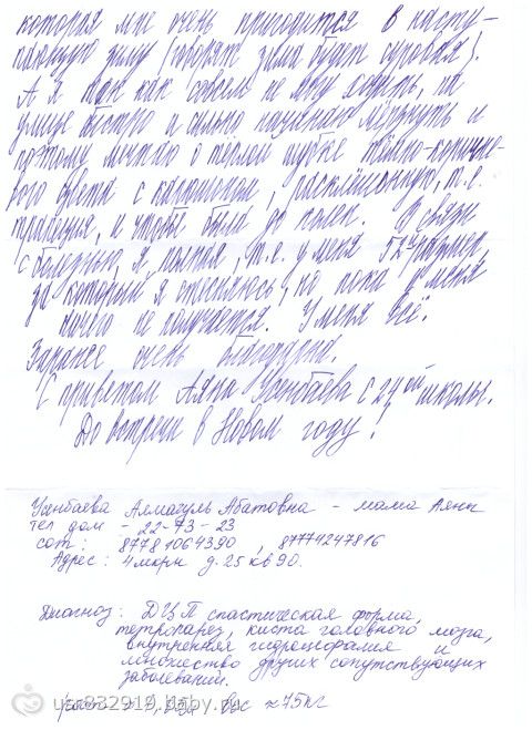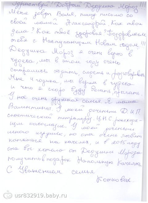 Настя, 6 лет. Просит Деда мороза подарить куклу Беби бон и коляску для нее. Диагноз -врожденный порок пояснично крестцового отдела позвоночника.