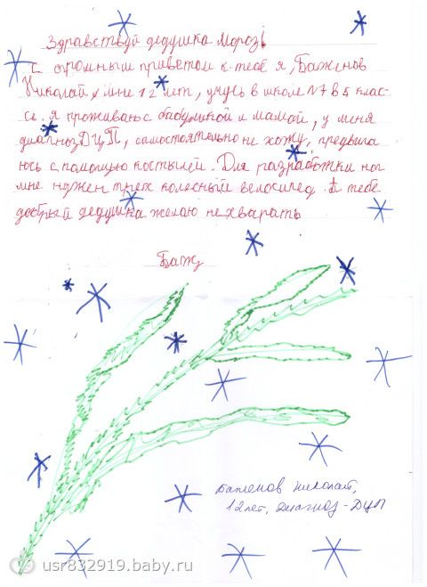 Баженов Коля. 12 лет. Диагноз ДЦП. Просит Деда мороза подарить ему велосипед. Живет с мамой и бабушкой.