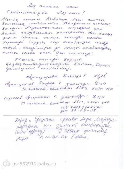 Дидар и Ерсултан. 12 и 14л.Диагнозы ДЦП. В семье их 6. Просят деда мороза подарить им зимние комбинезоны (или куртки). Примечание от нас. В детском магазине обещали сделать максим.скидку если найдется дед.мороз.цена от 10тыс тенге за куртку. Также этой семье можно было бы помочь дополнительно, или хотя бы подарить другим детям сладости.